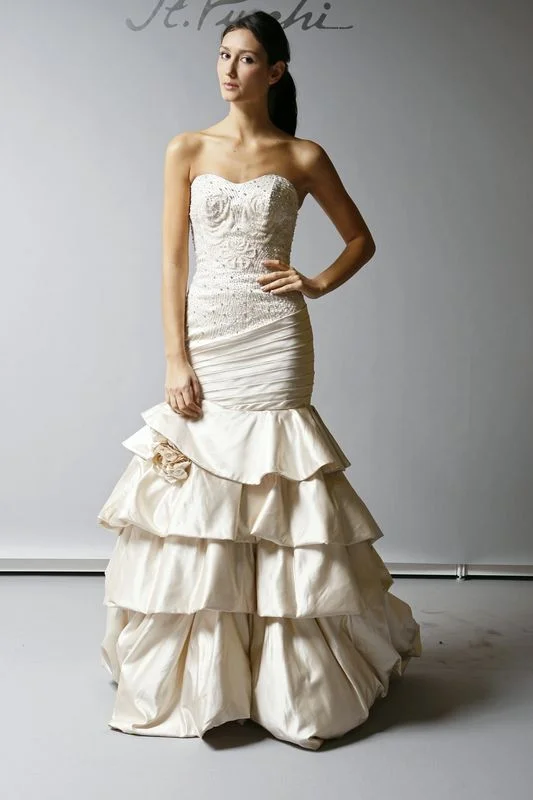 Fit an flare wedding gowns have been growing in popularity since they're a great silhouette for both showing curves as well as having a bit of drama. This duchess satin fit and flare St. Pucchi couture wedding gown is hand beaded and features a tiered and bustle skirt with a chapel train.
